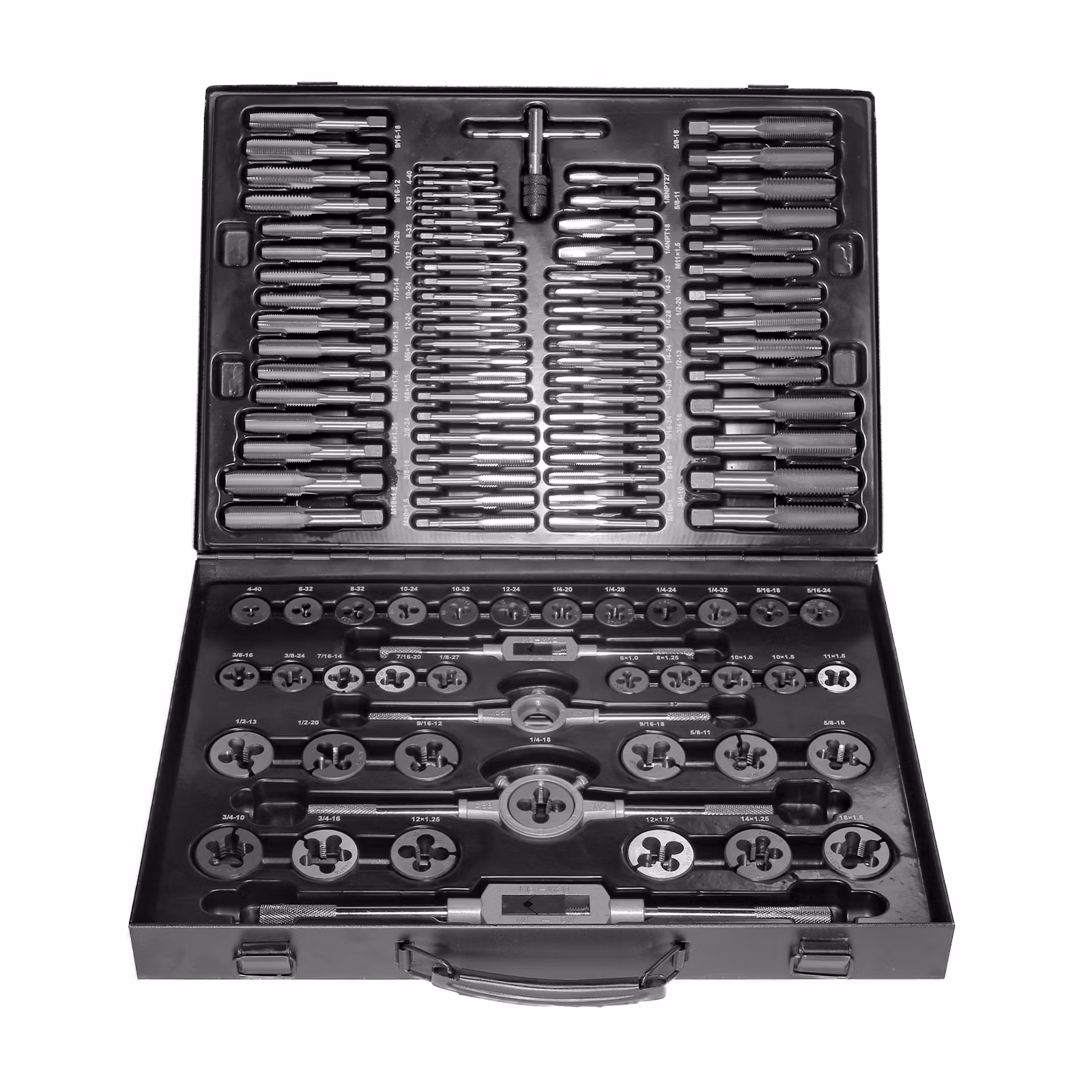 Tools: feeler gauges, tap holder & thread cutter holder in metal box