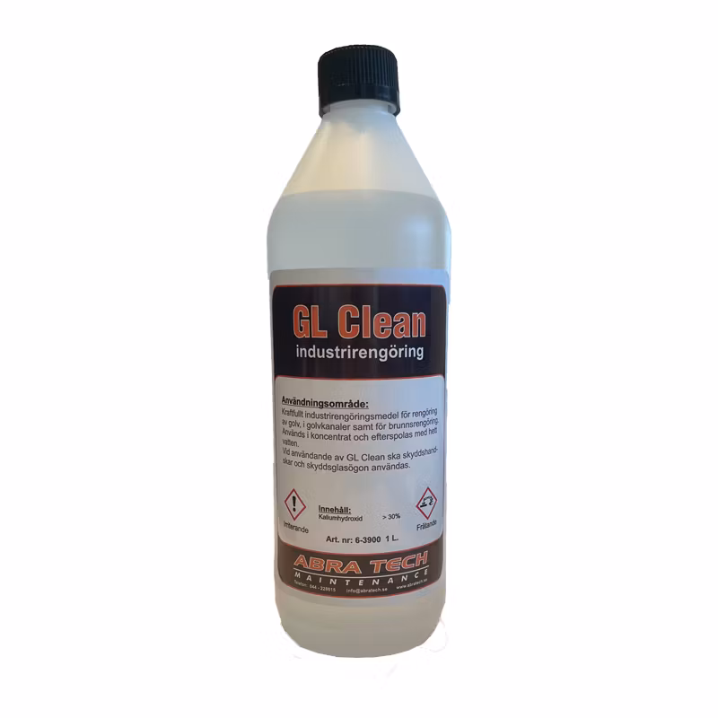 Högeffektiv avloppsunderhåll som rensar i rör och brunnar både snabbt och enkelt. Kan användas i alla slags rör och brunnar utan att de förstörs eller fräts sönder. Använd alltid skyddshandskar vid användning av GL Clean och andra starka vätskor. pH 14.
